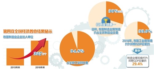 改革开放40多年来,我国制造业发展进入腾飞期。第四次全国经济普查结果显示,2018年末,我国制造业企业法人单位有327万个,比2013年末增长45.2%,占全部工业的比重为94.8%,比2013年末提高1.3个百分点;制造业企业资产总计过百万亿,比2013年末增长32.1%,年均增长5.7%。目前,我国制造业增加值约占全球制造业的30%,位列全球第一。
