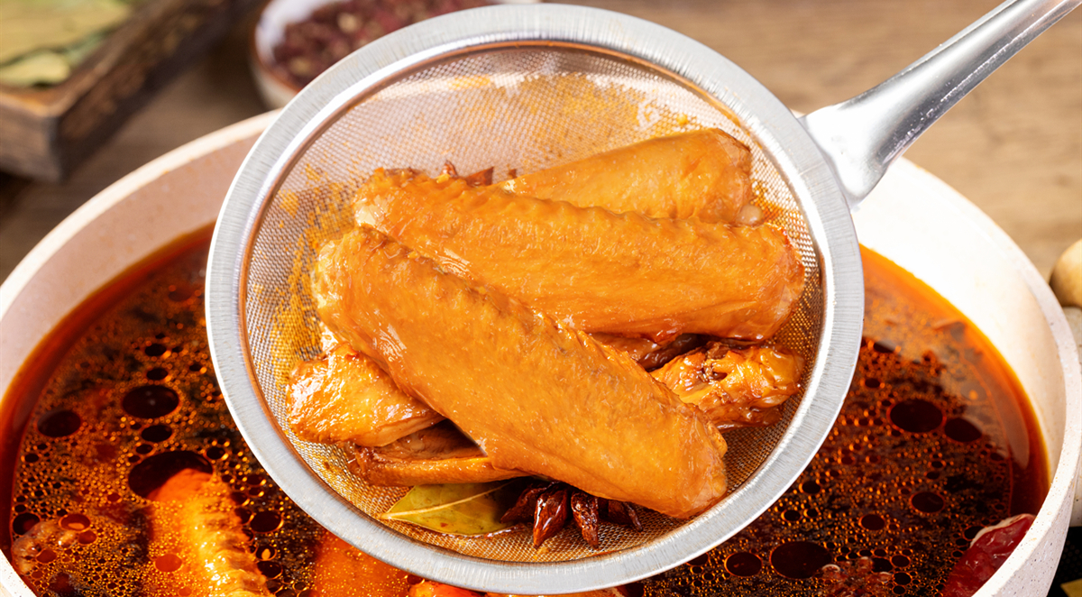特点:以优质鸡翅为原料,配以数十种天然香料,川菜技法卤制而成。产品色泽明亮,香气浓郁,肉质绵软,味道鲜美。